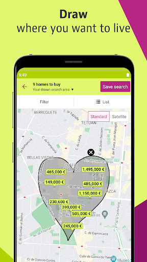 • Vẽ khu vực bạn thích trực tiếp trên bản đồ. Mở bản đồ idealista và dùng ngón tay vẽ khu vực bạn muốn sống. Tất cả các danh sách có sẵn sẽ xuất hiện ngay lập tức, cùng với giá của chúng, để bạn có thể so sánh chúng trong nháy mắt. Thật đơn giản.